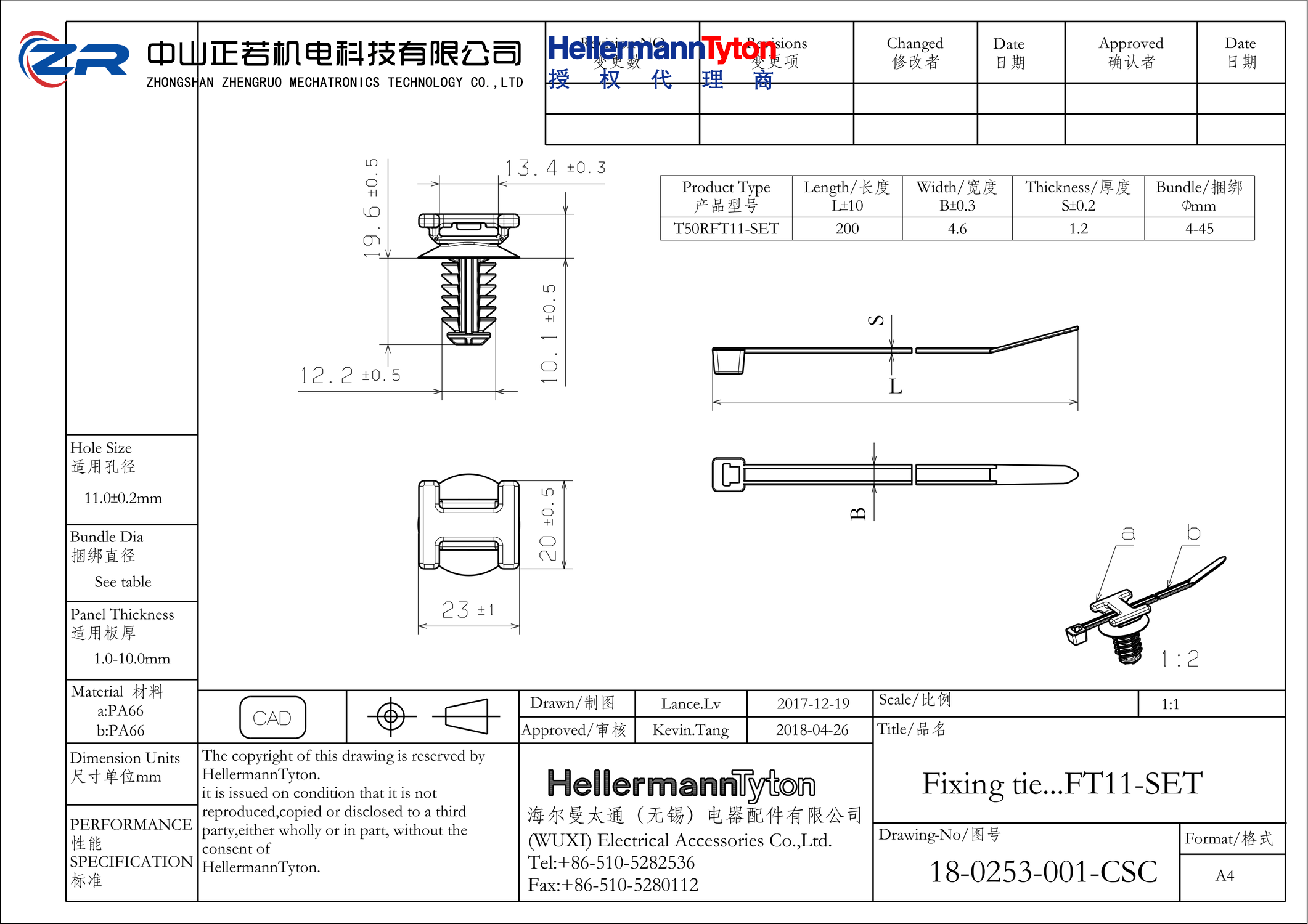 中山正若机电科技有限公司成立于2014年,是海尔曼太通Hellermanntyton一级授权代理商。产品包括海尔曼太通电缆扎带、汽车扎带、连接器卡扣、不锈钢扎带、热缩套管、编织网管、无卤线槽、扎带枪等。